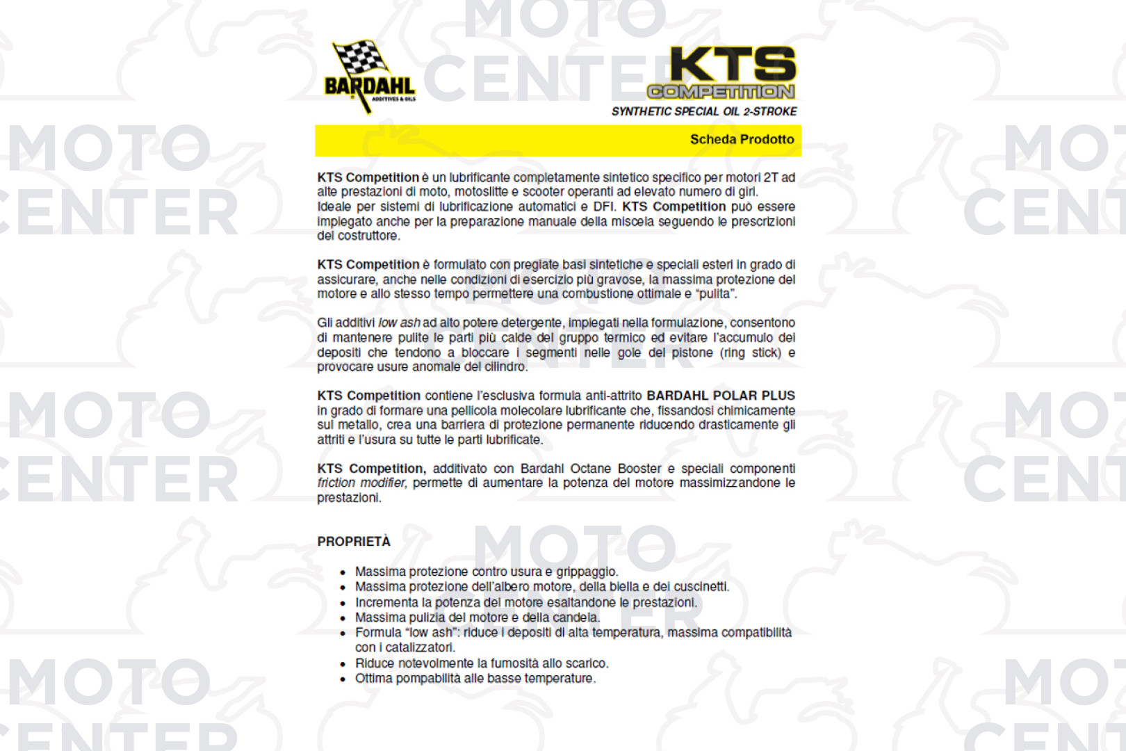 KTS Competition, additivato con Bardahl Octane Booster e speciali componenti friction modifier, permette di aumentare la potenza del motore massimizzandone le prestazioni.