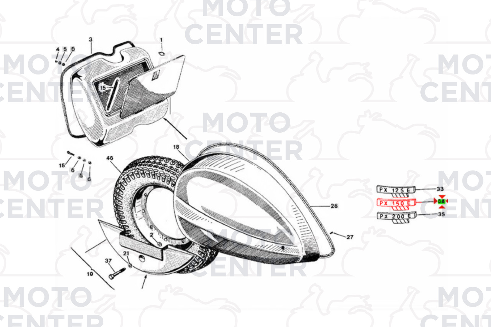Questa è la targhetta con la scritta "PX 150 E" che si applica sul cofano laterale sinistro della tua Vespa. Assicura un look perfetto e duraturo, essenziale per un restauro fedele o per mantenere la tua Vespa in condizioni impeccabili.