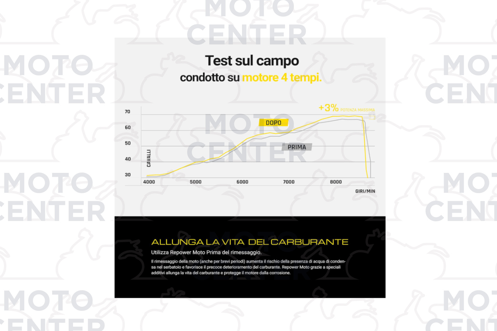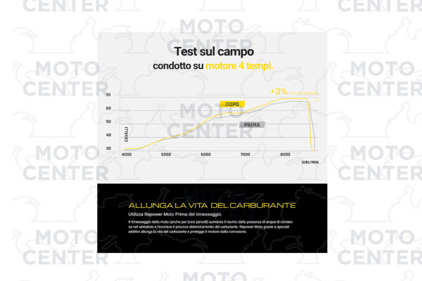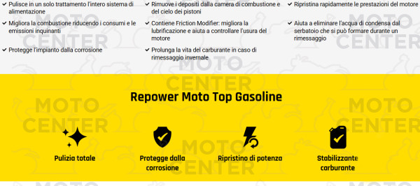 Top Gasoline Repower Moto contiene uno speciale pacchetto di sostanze detergenti e disperdenti che permettono di rimuovere efficacemente in un solo trattamento i depositi accumulati su iniettori, valvole, camera di combustione e cielo dei pistoni, ripristinando il regolare funzionamento del sistema di alimentazione e di conseguenza l’efficienza energetica del propulsore.