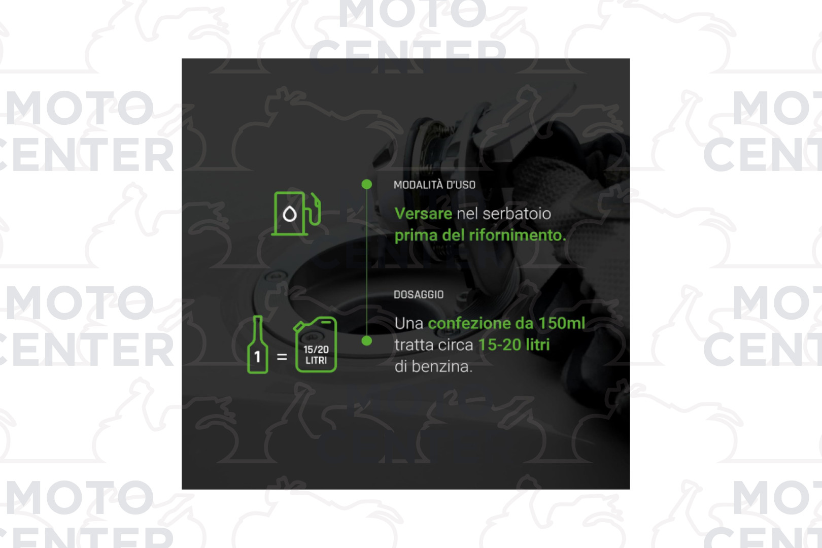 Per una migliore miscelazione con il carburante, si consiglia di versare l’additivo nel serbatoio appena prima di effettuare il rifornimento.